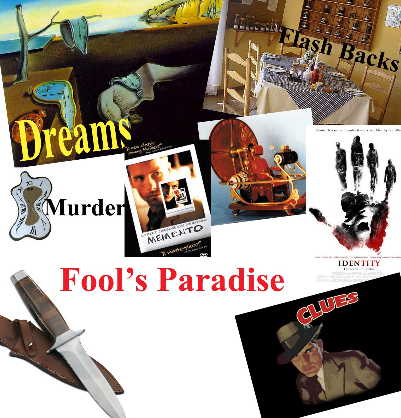 This is our moodboard for our thriller film. We have put the melted clocks on the moodboard as the time period changes in the film like in the dreams or flash backs. This is also why we have put a time machine picture on here as the flash backs go back in time. We wrote 'Dreams' on our mood board because dreaming, and day dreaming are recurring themes in our thriller 'Fool's Paradise'. Clues is also relevant because the protagonist takes on the challenge of finding out who or why his loved one died, he finds out using clues. The two films we have put on there, 'Memento' and 'Identity', are similar thriller films to our own one. In both films the protagonist has to find out clues to figure out a death or to how someone died, these follow thriller conventions.